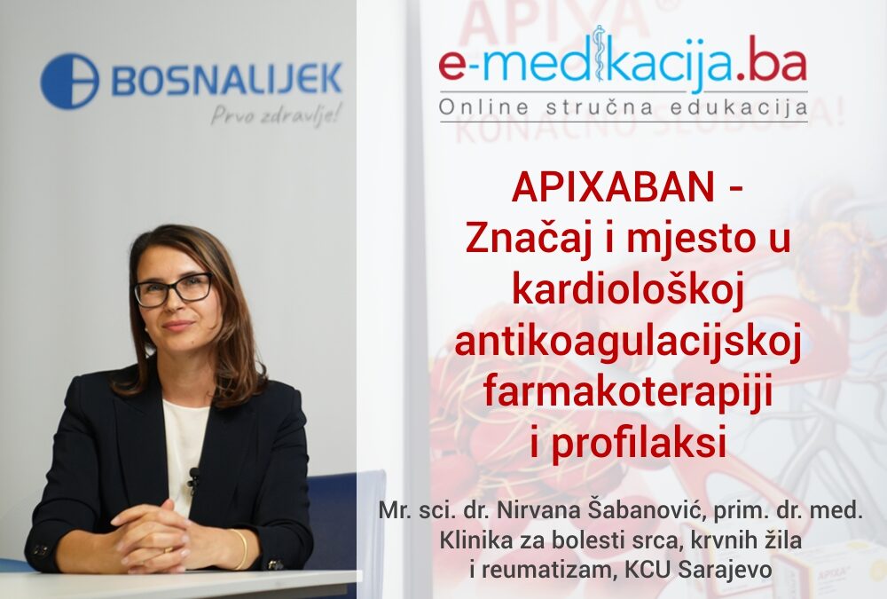 Ljekarska komora najavljuje novu stručnu online edukaciju: „APIXA®: Značaj i mjesto u kardiološkoj antikoagulacijskoj farmakoterapiji i profilaksi“, koju vodi mr. sci. dr. Nirvana Šabanović, prim. dr. med., iz Klinike za bolesti srca, krvnih žila i reumatizam, KCU Sarajevo.